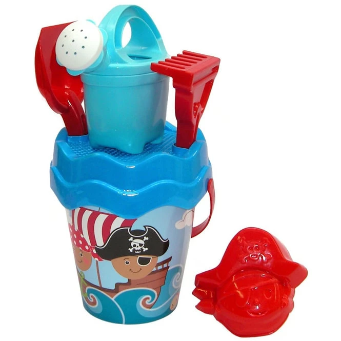 Dieses 6-teilige Eimerset im Piraten-Design von Androni ist genau das Richtige für kleine Seeräuber, denn es enthält alles, was zum Ausgraben eines großen Schatzes benötigt wird. So ist das Set sowohl für den Sandstrand als auch den Sandkasten perfekt geeignet. Mit dem Sandförmchen kann eine ganze Piratencrew erschaffen werden, die bei der Schatzsuche hilft, mit dem Sieb kann der Sand nach Edelsteinen und Münzen durchsucht werden, die Schaufel hilft beim Ausgraben einer Schatzkiste und beim Bauen einer Piratenburg und der Rechen sorgt für das Verschwinden von verräterischen Spuren. Tauchen Sie mit Ihrem Kind in die abenteuerliche Piratenwelt ein.