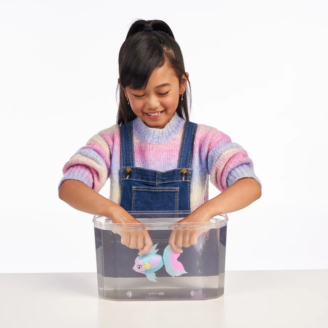 Lil’ Dippers von Little Live Pets sind am liebsten im Wasser, wo sie stolz ihre Flossen präsentieren können! Diese wunderschönen Fische erwachen beim Auspacken wie durch Zauberhand zum Leben! Tauche den Beutel samt Fisch unter Wasser. Sobald sich der Beutel mit Wasser füllt, erwachen die wunderschönen Spielzeugfische zum Leben. Sie schwimmen aus der Packung heraus und präsentieren dabei stolz ihre eleganten Flossen! Die Bewegungen der Lil’ Dippers sehen verblüffend echt aus, wenn sie anmutig durchs Wasser schwimmen und dabei ihren farbenfrohen Schwanz und ihre eleganten Flossen zur Schau stellen! Diese fabelhaften Fische haben eine schillernde Persönlichkeit und einen unverwechselbaren Stil. Jeder Lil’ Dipper wird mit einer magischen Futterflasche geliefert. So wird das Spielen mit deinem Fisch zum interaktiven Erlebnis. Sieh zu, wie sie zur Flasche hinschwimmen und sich füttern lassen.
