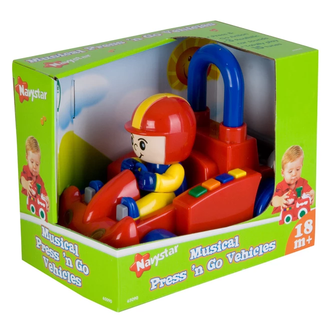 Entdecke die verschiedenen Knöpfe zur Musik- und Lichtwiedergabe. Beim Drücken auf einen der Knöpfe fährt das Besttoy Musik Fahrzeug los.