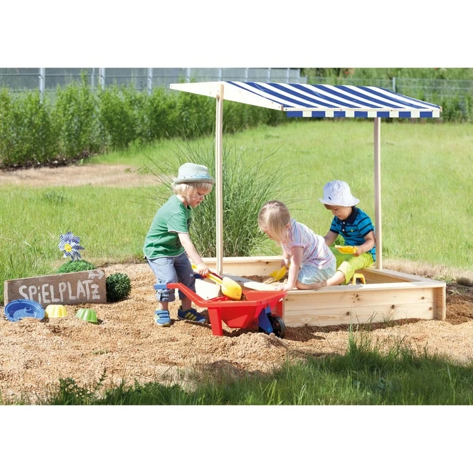 Der Sandkasten mit Dach ist 120×120 groß und besteht aus 16mm dickem unbehandeltem Holz.