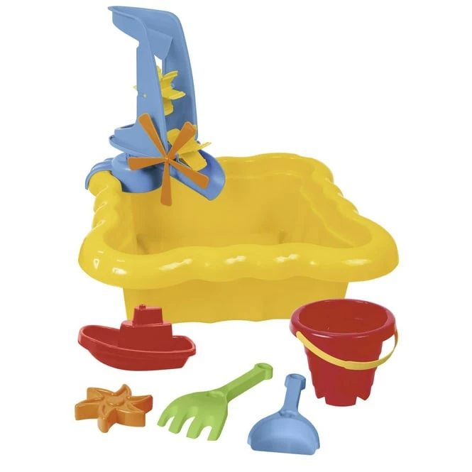 Das Set besteht aus einem Sandkasten, einem kleinen 0,8-l-Eimer, einer Wassermühle mit Befestigung am Sandkastenrand, einer Schaufel, einem Rechen, einer Form und einem Schiffchen.Das Spielzeug ist aus hochwertigstem Material gefertigt, handlich und stabil.