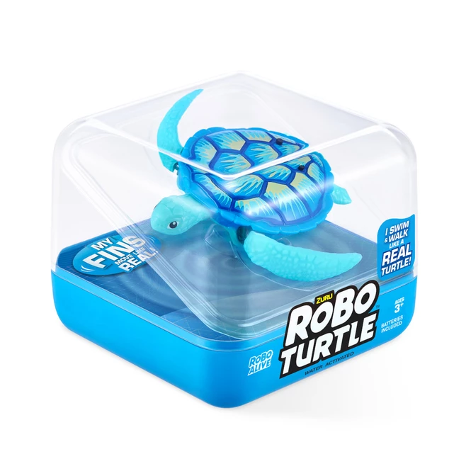 Die neue Robo-Schildkröte ist das ultimative, lebensechte Roboter-Haustier! Die einzigartige Roboter-Technologie erweckt diese tropischen Schildkröten zum Leben – an Land und im Wasser. Setze die Schildkröte ins Wasser und beobachte, wie sie lebendig wird oder lass sie an Land in der Sonne herumlaufen! Du wirst nicht glauben können, wie lebensecht sie dank der Roboter-Technologie wirkt. Nimm deine Robo-Schildkröte zum Schwimmen mit in den Pool oder setze sie in eine Wasserkaraffe, um deiner Familie einen Streich zu spielen! Es gibt Robo-Schildkröten in 4 bunten Farben, die du sammeln kannst, um dein Robo-Aquarium zu vervollständigen! Diese Robo-Schildkröten sind mehr als lebendig – sie sind Robo Alive!