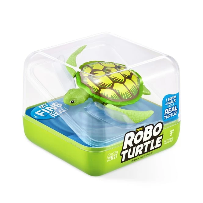 Die neue Robo-Schildkröte ist das ultimative, lebensechte Roboter-Haustier! Die einzigartige Roboter-Technologie erweckt diese tropischen Schildkröten zum Leben – an Land und im Wasser. Setze die Schildkröte ins Wasser und beobachte, wie sie lebendig wird oder lass sie an Land in der Sonne herumlaufen! Du wirst nicht glauben können, wie lebensecht sie dank der Roboter-Technologie wirkt. Nimm deine Robo-Schildkröte zum Schwimmen mit in den Pool oder setze sie in eine Wasserkaraffe, um deiner Familie einen Streich zu spielen! Es gibt Robo-Schildkröten in 4 bunten Farben, die du sammeln kannst, um dein Robo-Aquarium zu vervollständigen! Diese Robo-Schildkröten sind mehr als lebendig – sie sind Robo Alive!